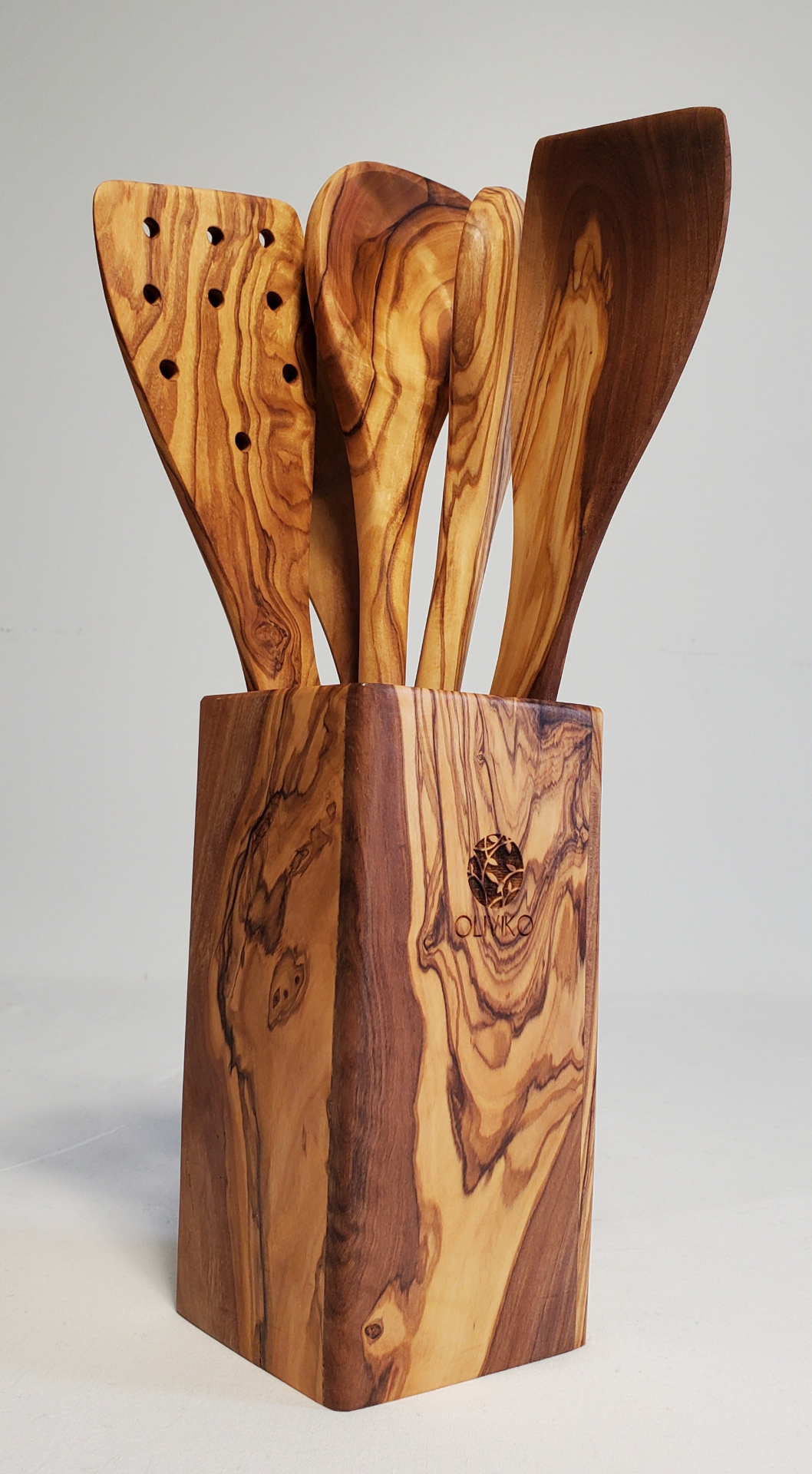 Enhance your culinary experience with the OLIVIKO Handmade Olive Wood Holder+ Utensils Kit. This set includes a unique combination of 5 utensils, 2 spatulas, and 3 spoons, all crafted from 100% olive wood. Each piece is naturally beautiful, with visual deviations that showcase the unique growth and grain of the wood.