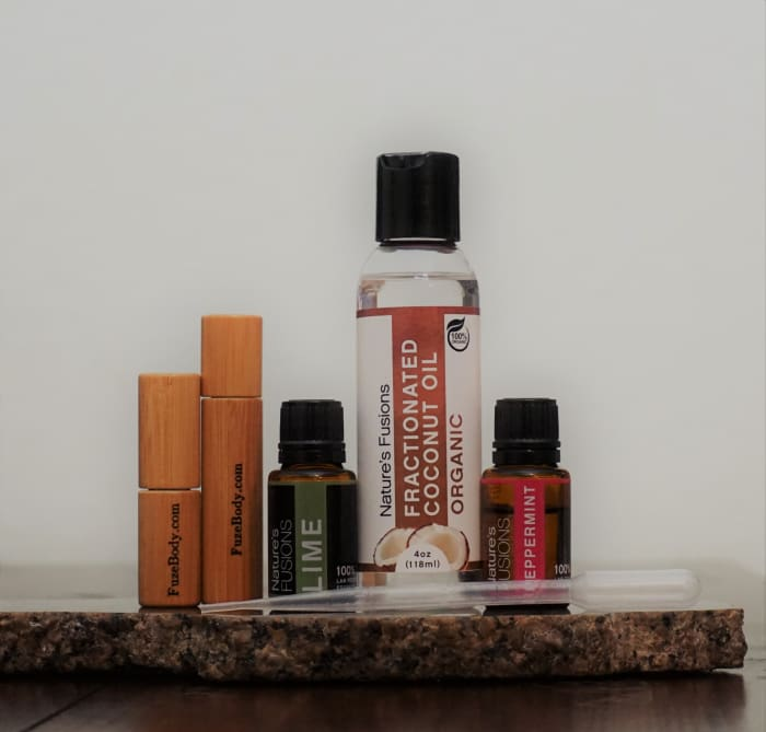 1 bottle (4oz) of Fractionated Organic Coconut Oil DIY recipe: https://fuzebody.com/blogs/fuze-body-blog/how-to-make-your-own-essential-oil-roller