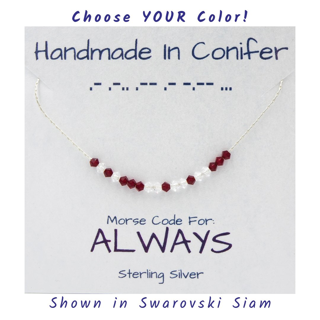 Elevate your style with this stunning and sparkling Handmade ALWAYS Morse Code Sterling Silver Necklace. The necklace features Austrian Swarovski® Crystals that beautifully spell out the word 'ALWAYS' in Morse Code. Customize the color of the dots to match your birthstone, anniversary color, or simply your favorite color. The dashes are made with clear Crystal, adding an elegant touch to the design.