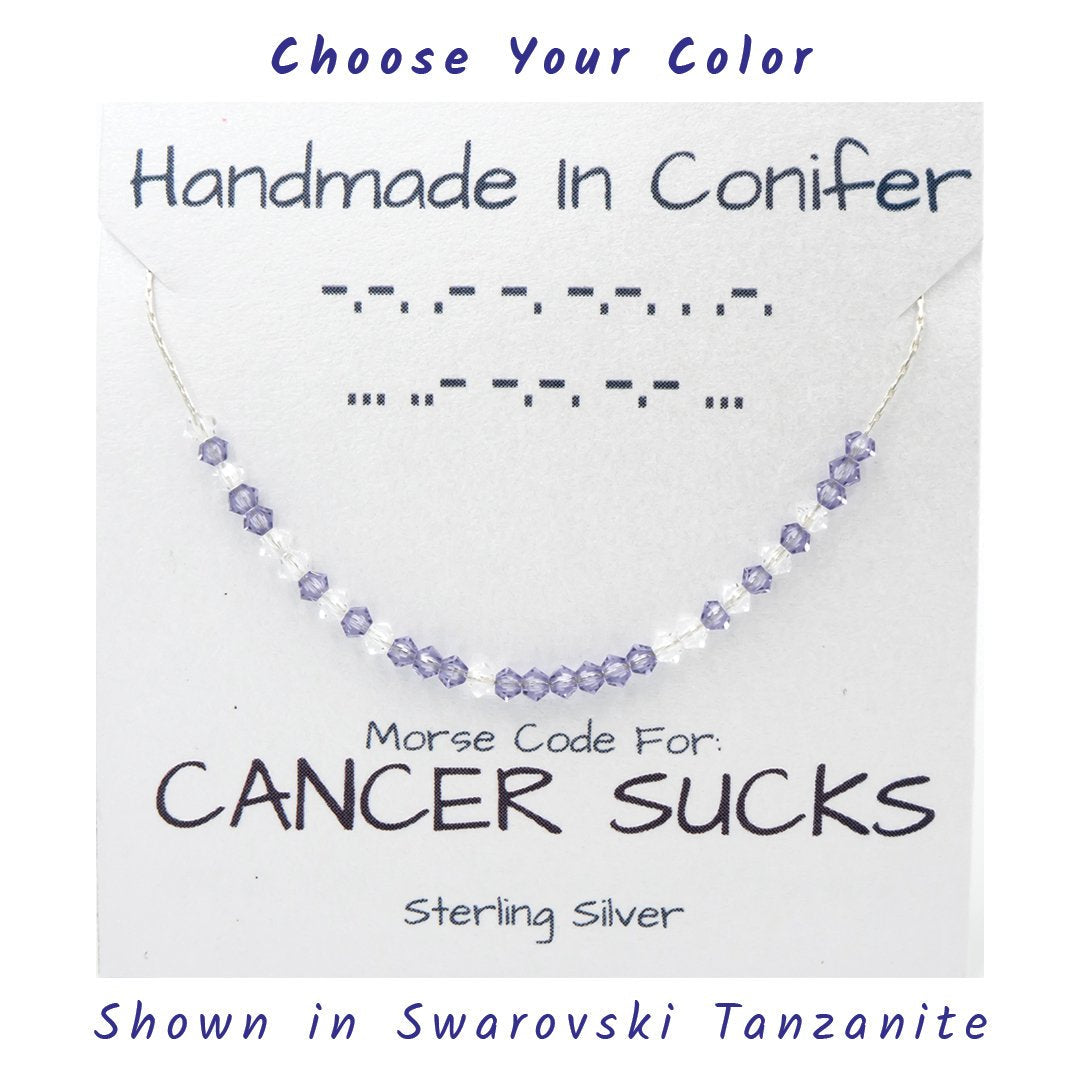 There is no way around it - Cancer Sucks. Wear this necklace and make a statement against all forms of cancer. The necklace features Swarovski® Crystals arranged in Morse Code to spell out CANCER SUCKS, with each color representing a specific type of cancer. The dots are colored crystals, and the dashes are clear crystals. Choose Tanzanite's lavender purple to represent all cancers or select a color to represent a specific cancer.