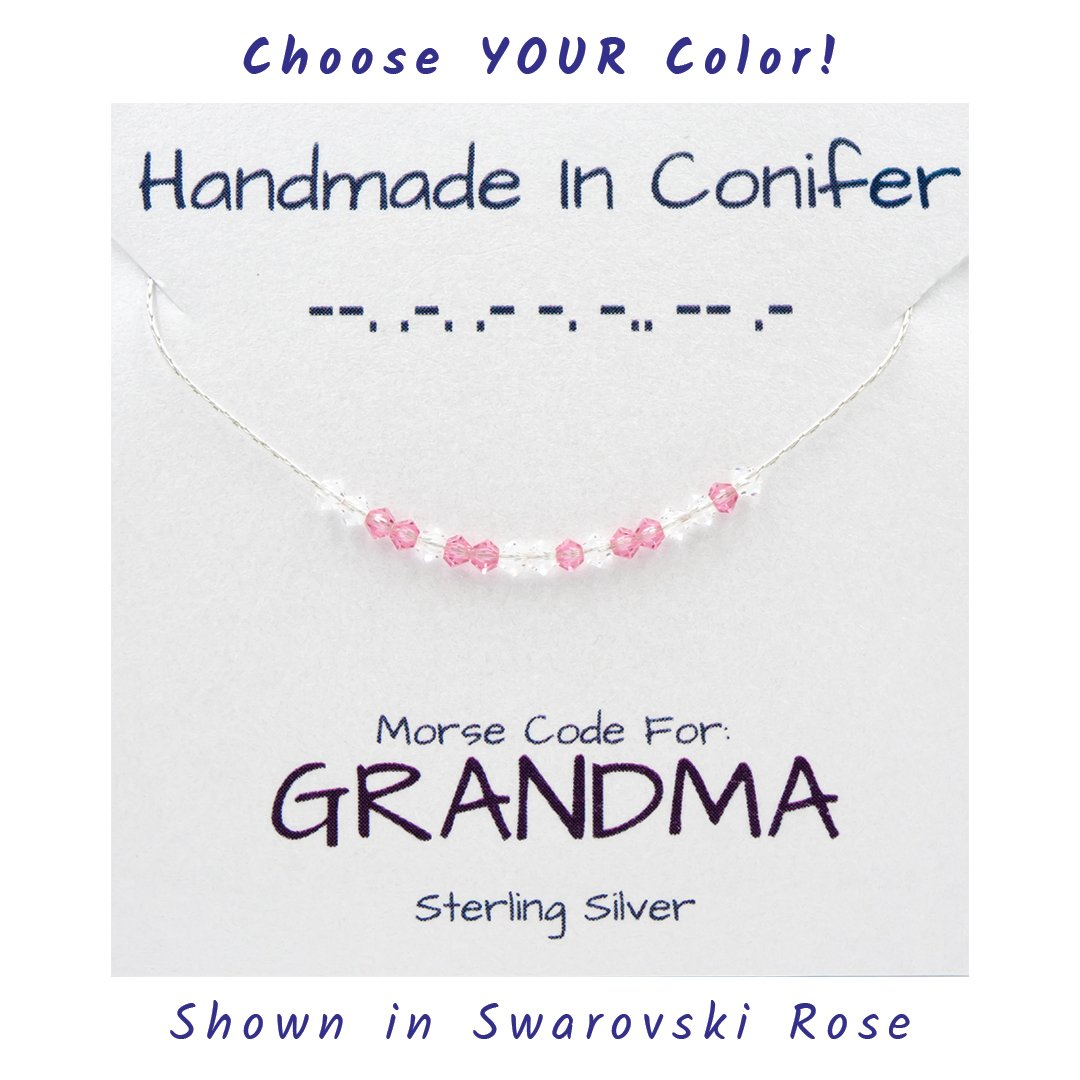 Delicate and stunning, this Morse Code necklace spells out GRANDMA with sparkling Austrian Swarovski® crystals. You can choose the color for the dots, whether it's your birthstone color, anniversary color, or simply your favorite color. The dashes are made with clear Crystal, adding a touch of sophistication to the design.