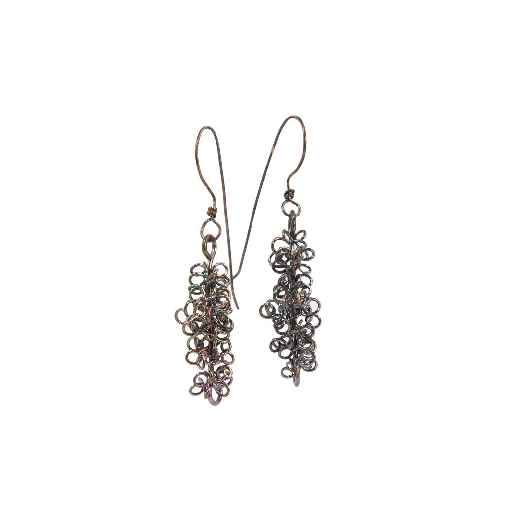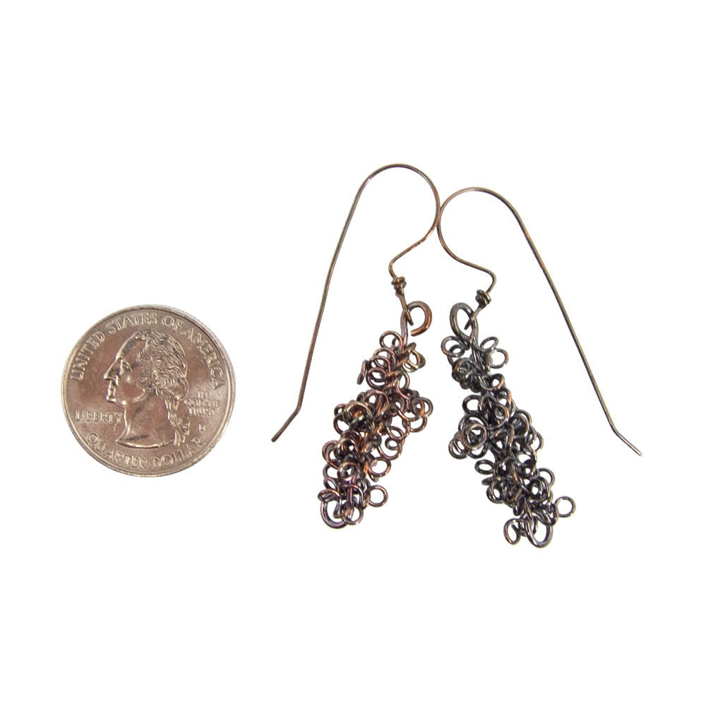 These Handmade Masses of Copper Coils Earrings are a unique and fun addition to your jewelry collection. Each earring is meticulously crafted with 4 feet of raw copper wire, formed into tiny coils and stretched into a freeform shape around a center wire. The ear wires are hand-formed with a long tail that hangs down behind your ear, creating a distinctive and eye-catching look.