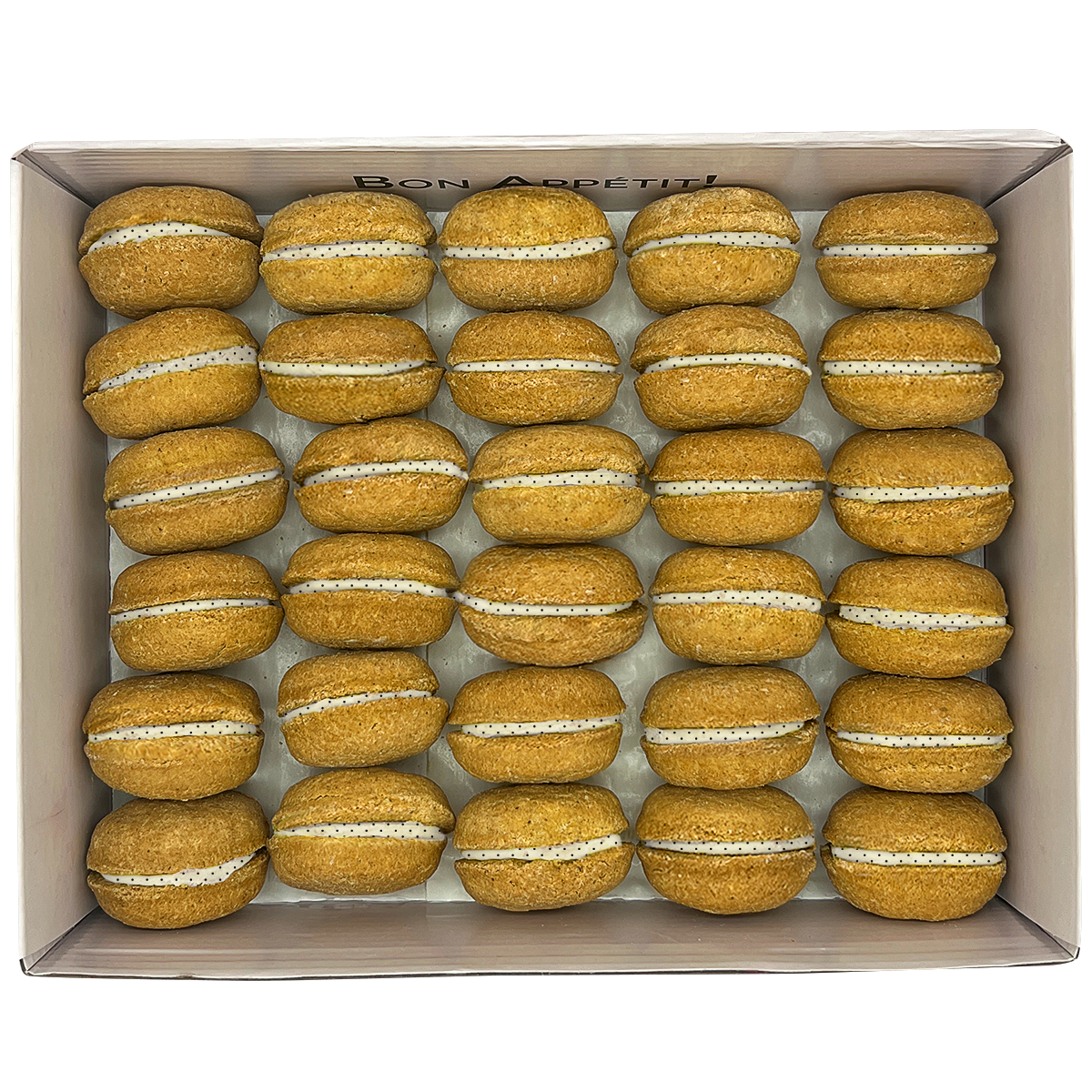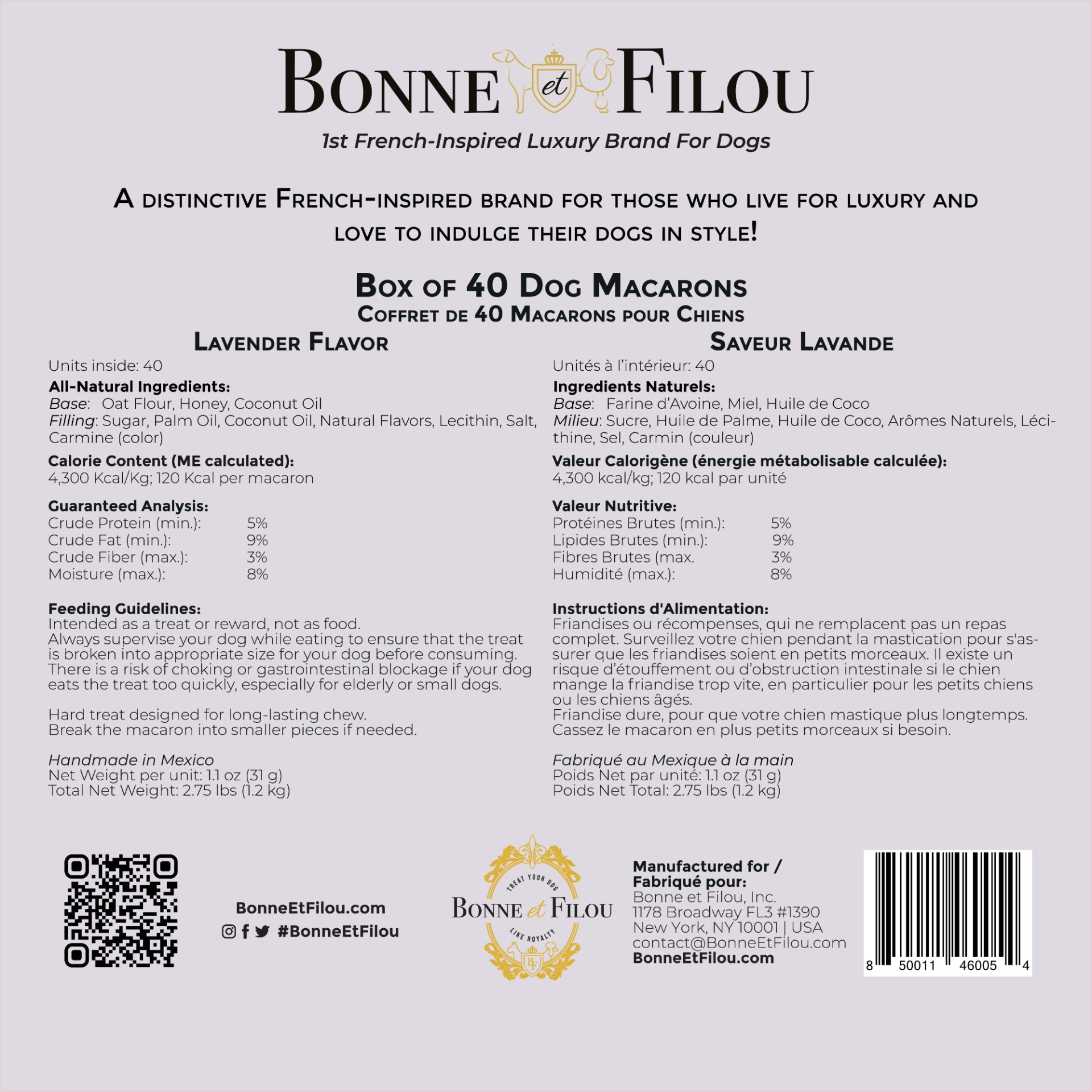 Indulge your furry friend with this luxurious 40 Count Dog Macaron Treats Gift Box. Handmade with premium human-grade ingredients, these delectable treats are perfect for eco-friendly, cost-conscious pet lovers who want to spoil their dogs like royalty. The gift box includes 40 dog macarons, baked to perfection in small batches with 100% natural, corn-free, and wheat-free ingredients. With no artificial coloring or preservatives, these long-lasting chew treats are not only delicious but also healthy. The macarons have a long shelf life and require no refrigeration, making them convenient for pet owners. Each macaron is made with oat flour, honey, coconut oil, and an all-natural flavored yogurt filling. Whether you're planning a dog-themed party or simply want to treat your furry friend, this gift box is the perfect choice. Order now and make every month a tasty surprise with a different flavor! Subscribe and enjoy the luxury of variety in your dog's treat selection. Please note that this product is intended as a treat or reward, not as food. Always supervise your dog while eating and ensure the treats are broken into appropriate sizes. The 40-count flat packaging is complimentary and available upon request. Get ready to be the talk of the town for throwing the best parties and giving the best gifts to your beloved pets!