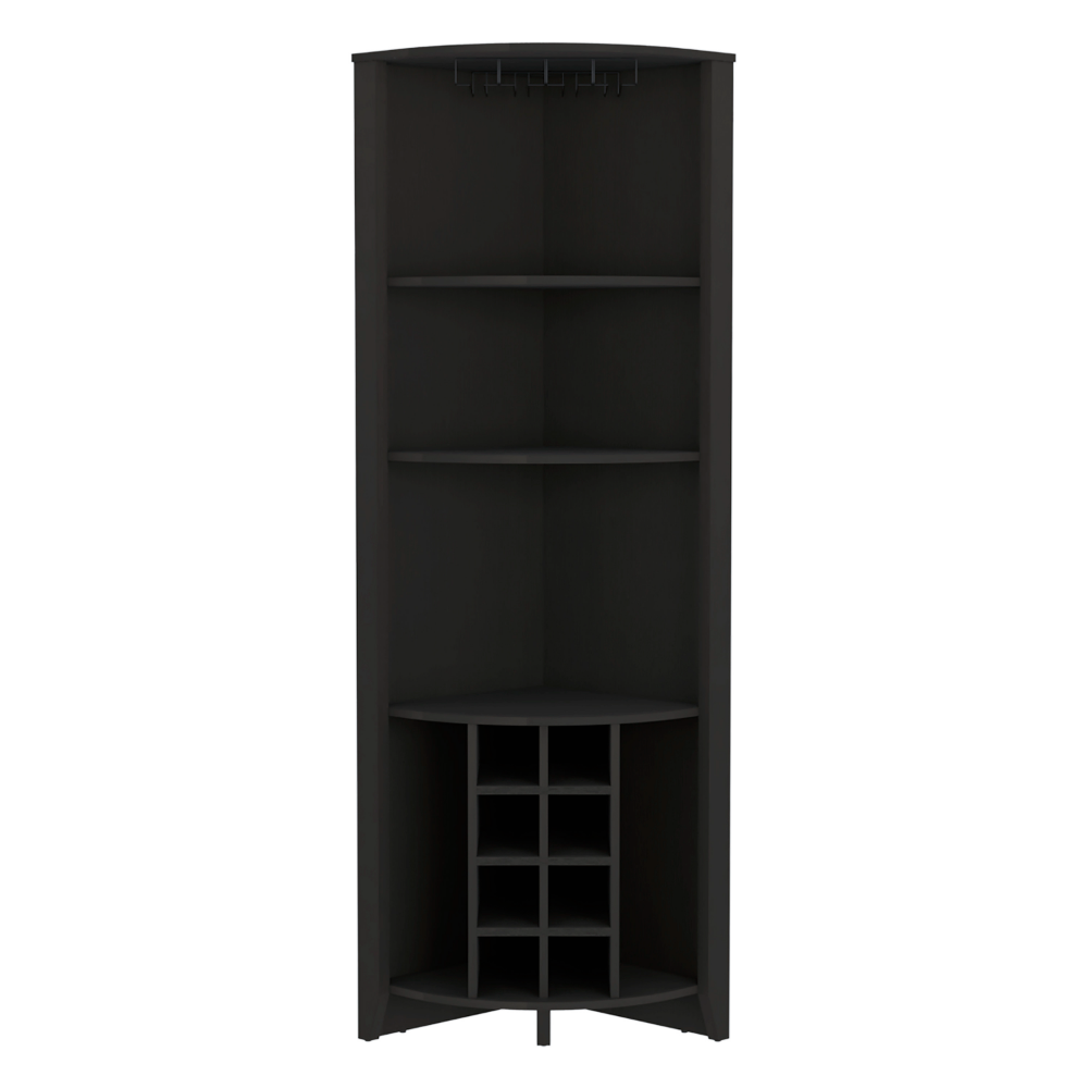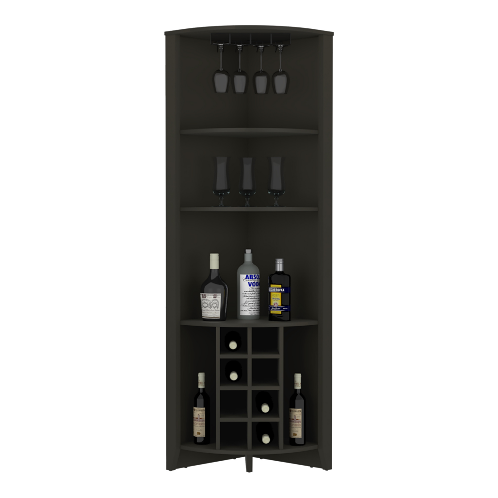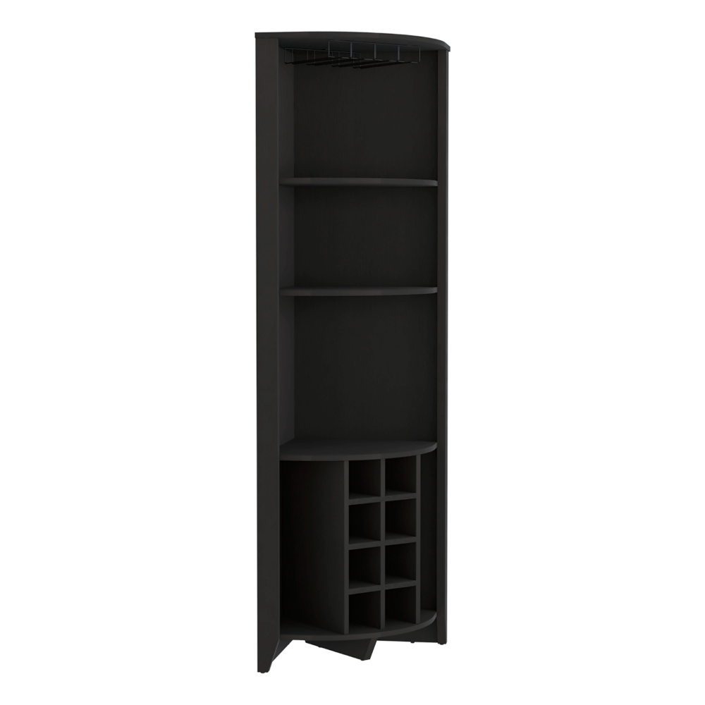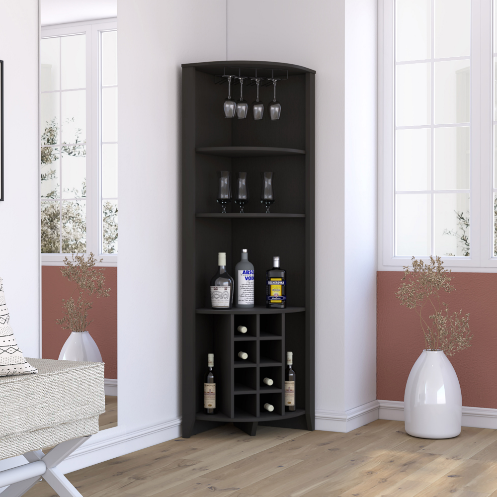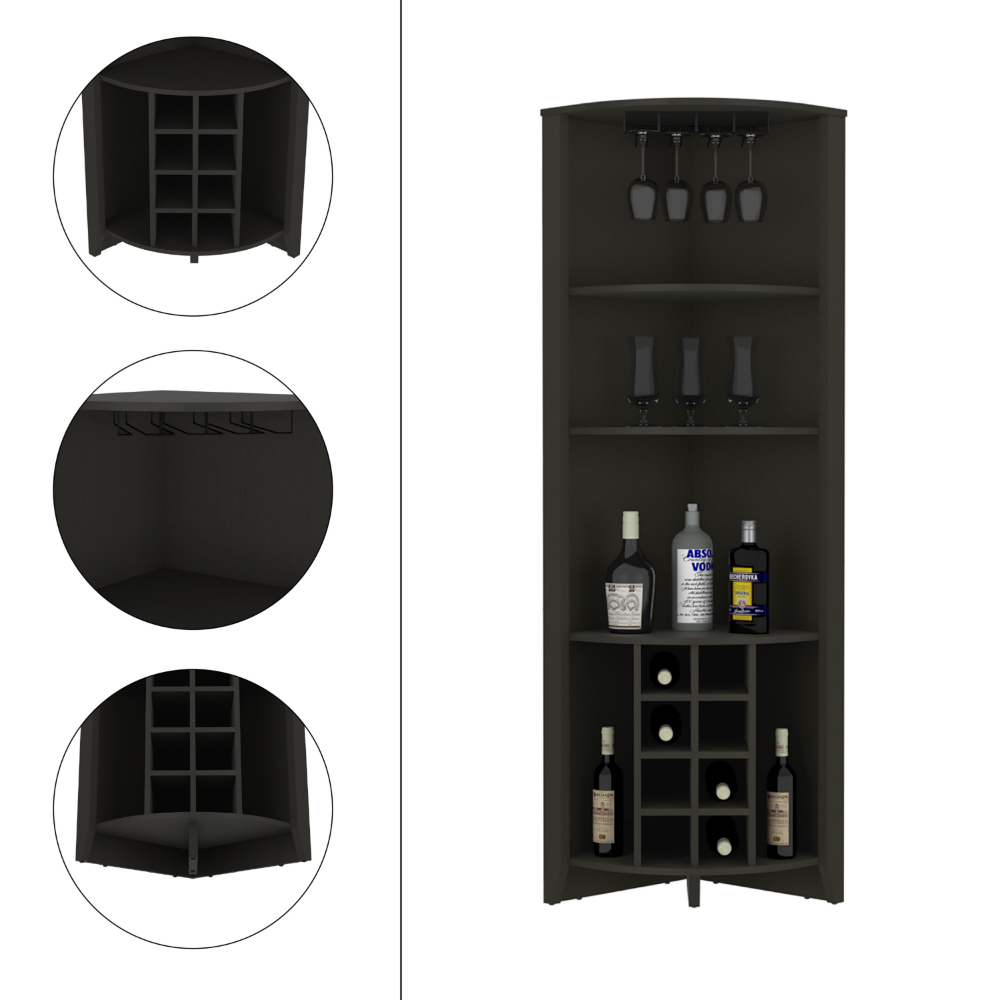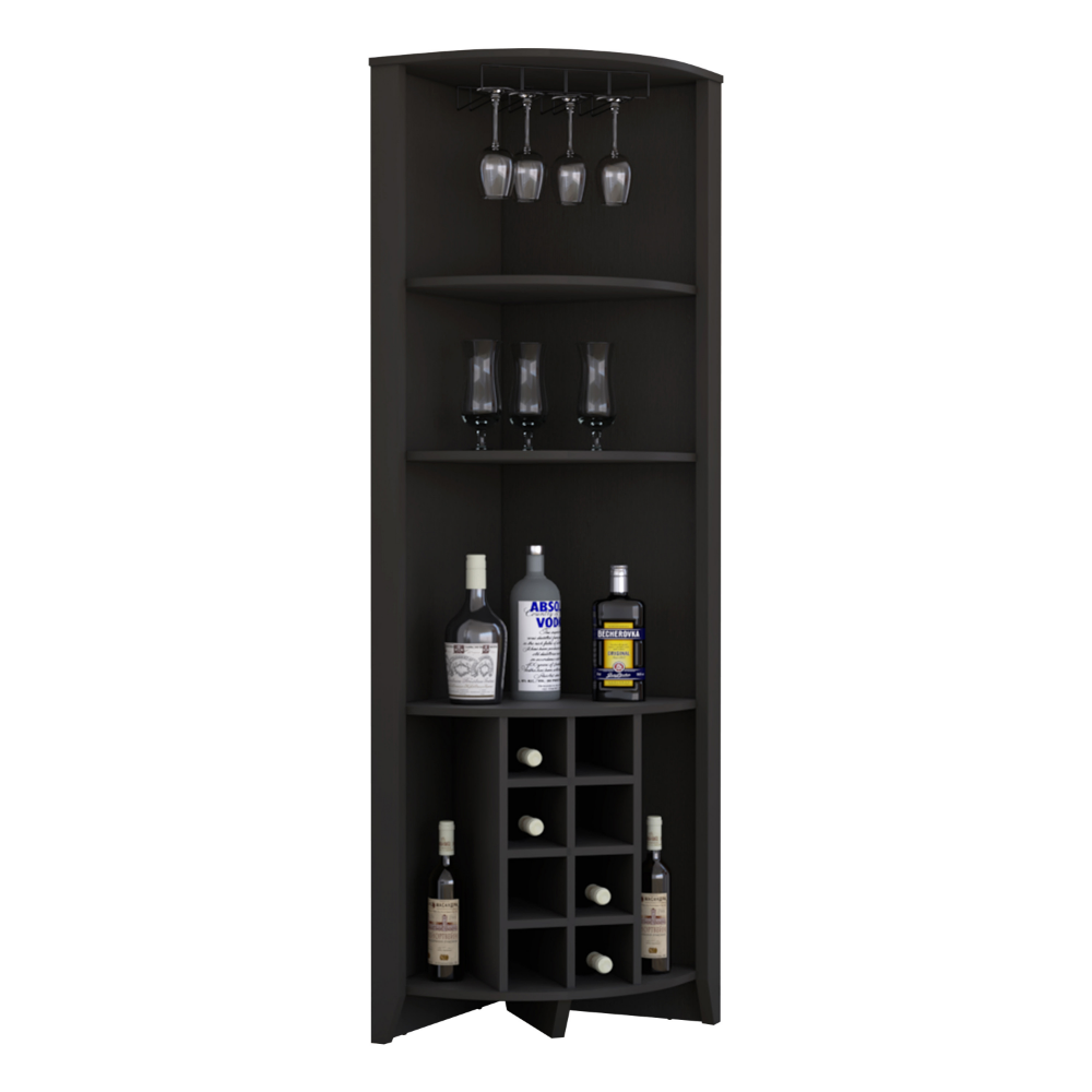 The Giza Corner Bar Cabinet is perfect for your urban home. With its elegant black wengue, macadamia, and dark brown finish, it adds a touch of sophistication to any space. This cabinet offers ample storage space with three shelves, eight wine cubbies, and a cup rack for your glasses.