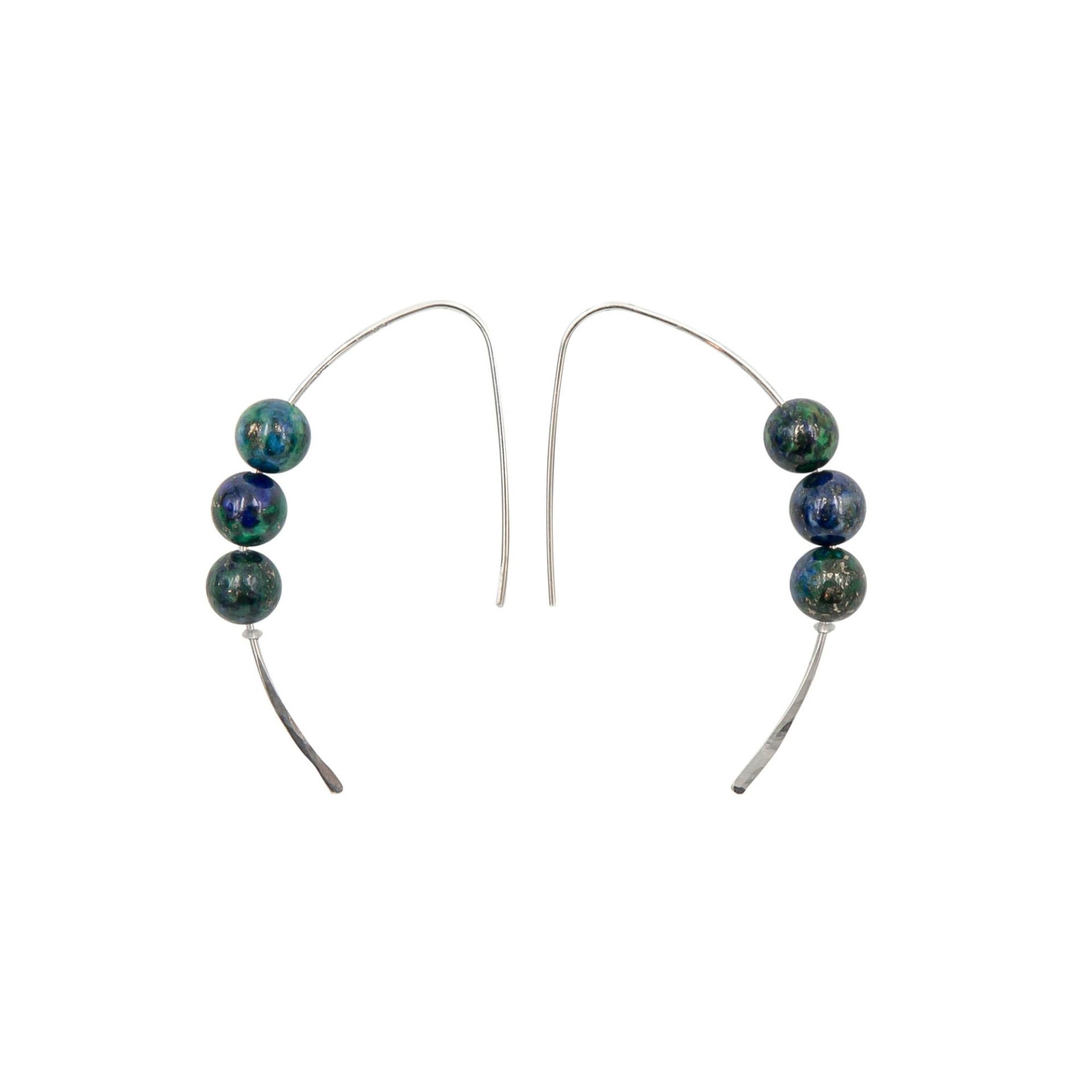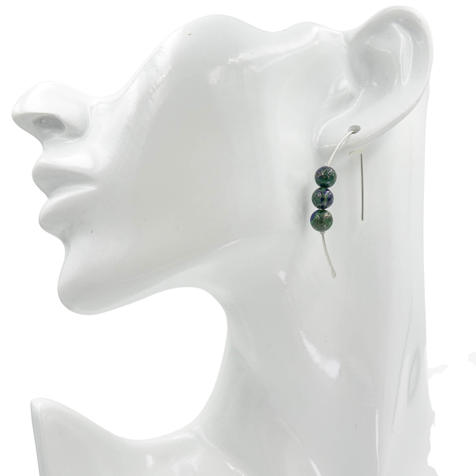 The rich blue and green patterns of Azurite resemble a mini-Earth, creating a unique and eye-catching aesthetic. Each stone is suspended on the gentle curve of these earrings, enhancing their beauty and charm.