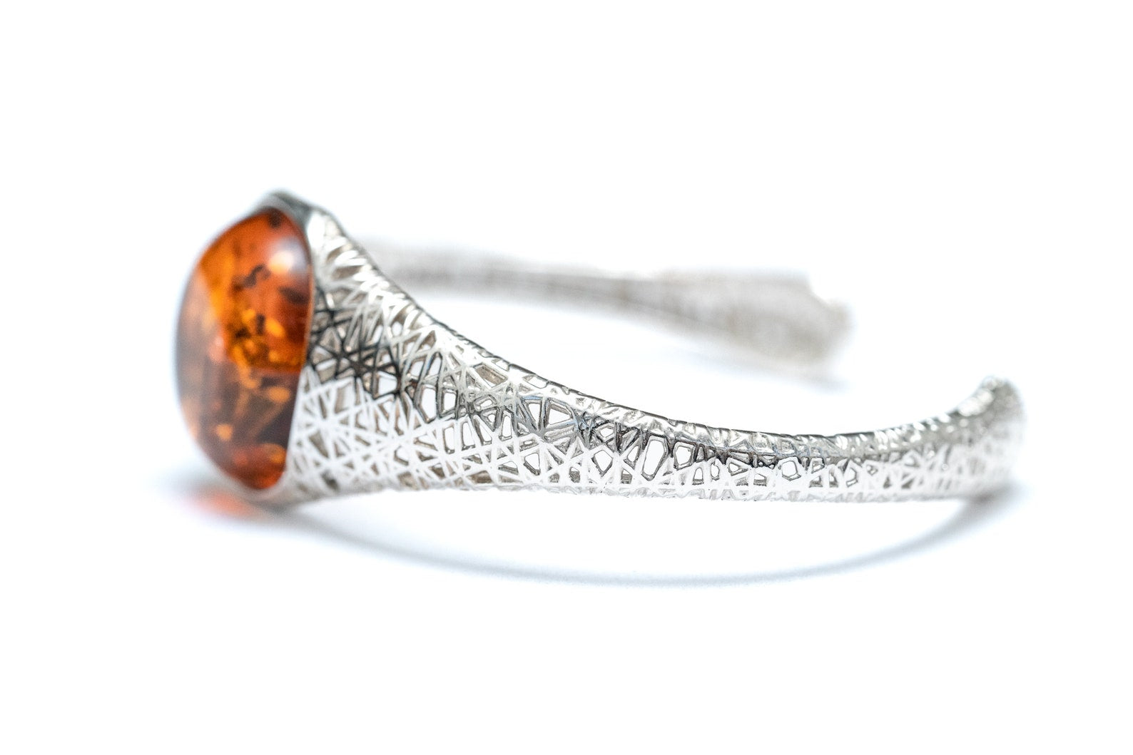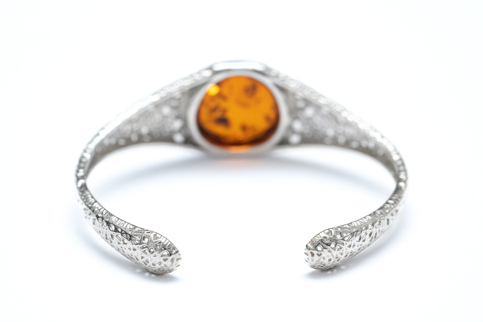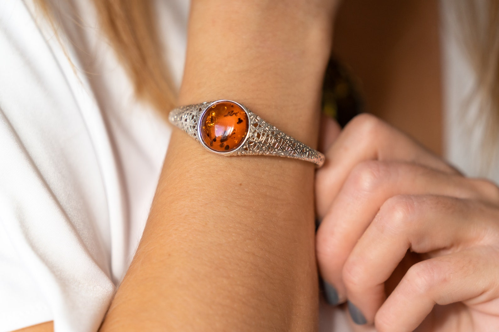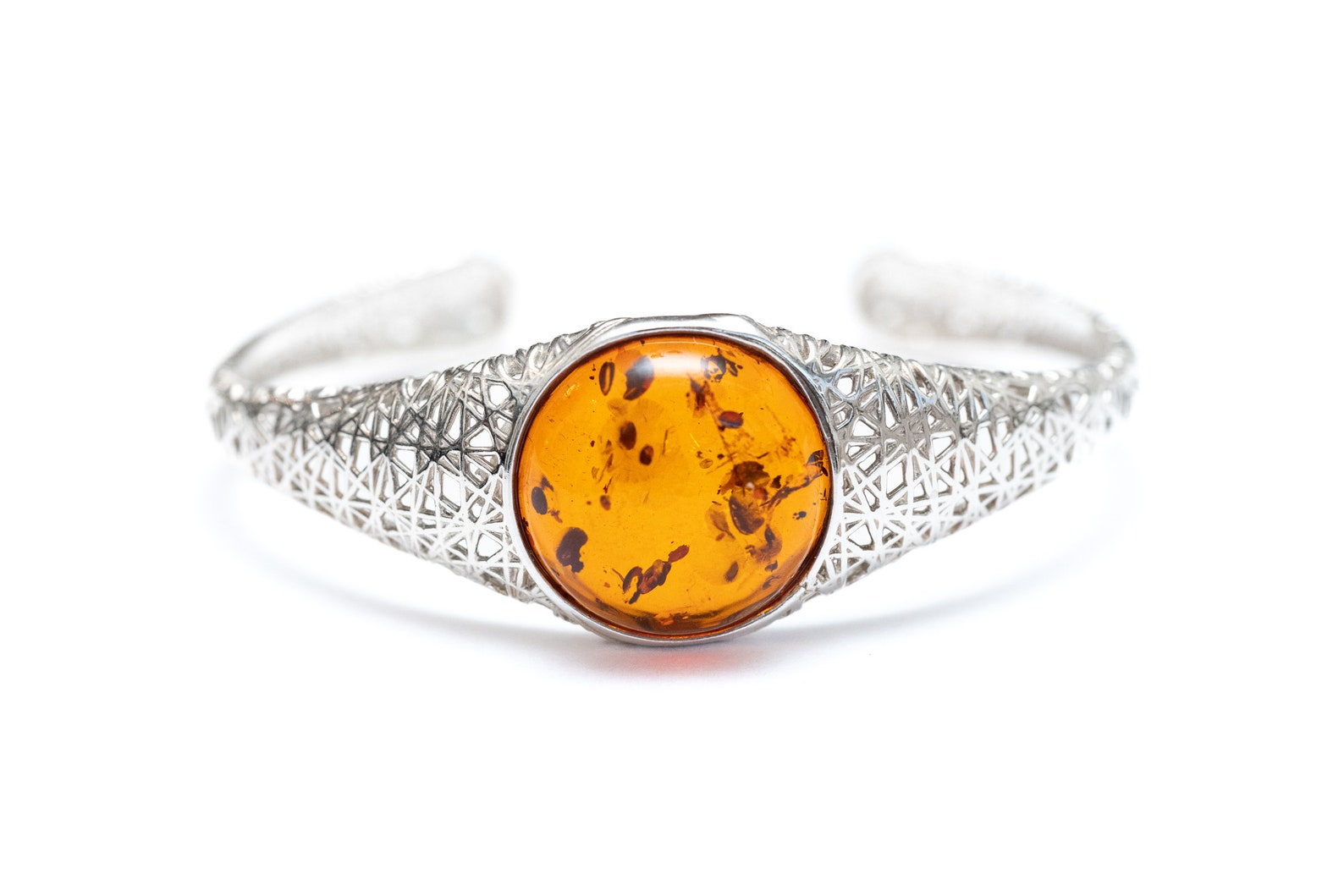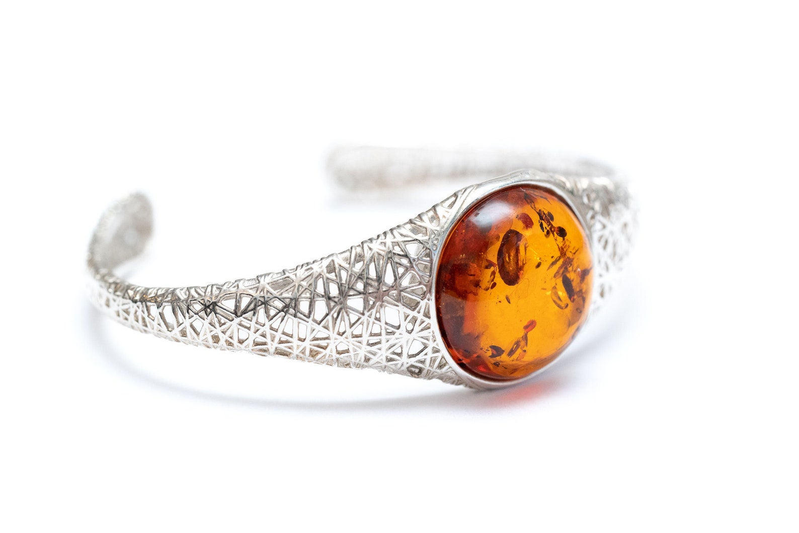 Add a touch of elegance to your outfit with this Handmade Modern Amber Arm Cuff. Crafted with intricate silver filigree and a stunning round cognac Baltic Amber Stone, this arm cuff is a true statement piece. Made with .925 Sterling Silver and hallmarked by the Birmingham Assay Office, this cuff is of the highest quality.
