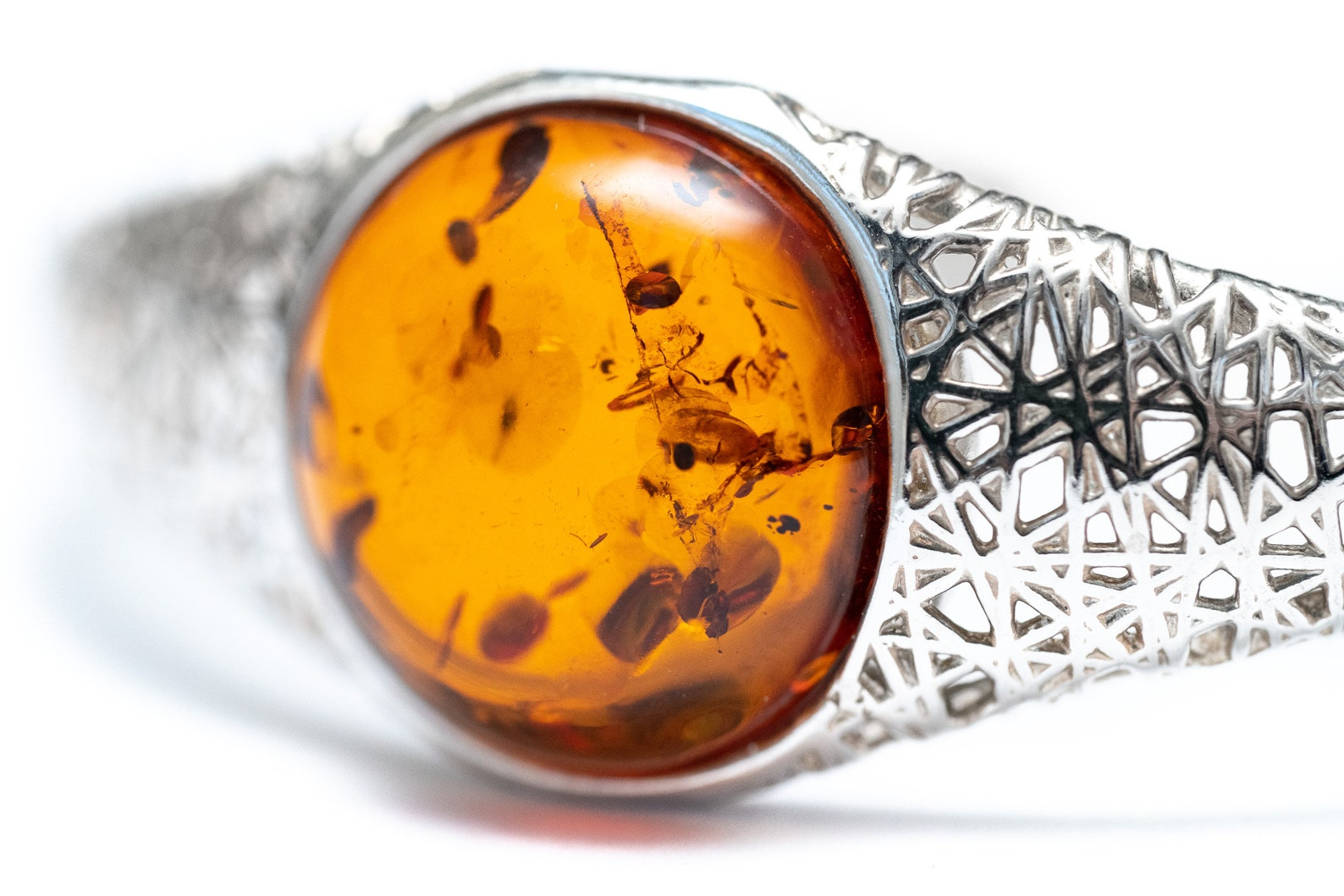 - Round cognac Baltic Amber Stone with rich orange hue and incredible clarity