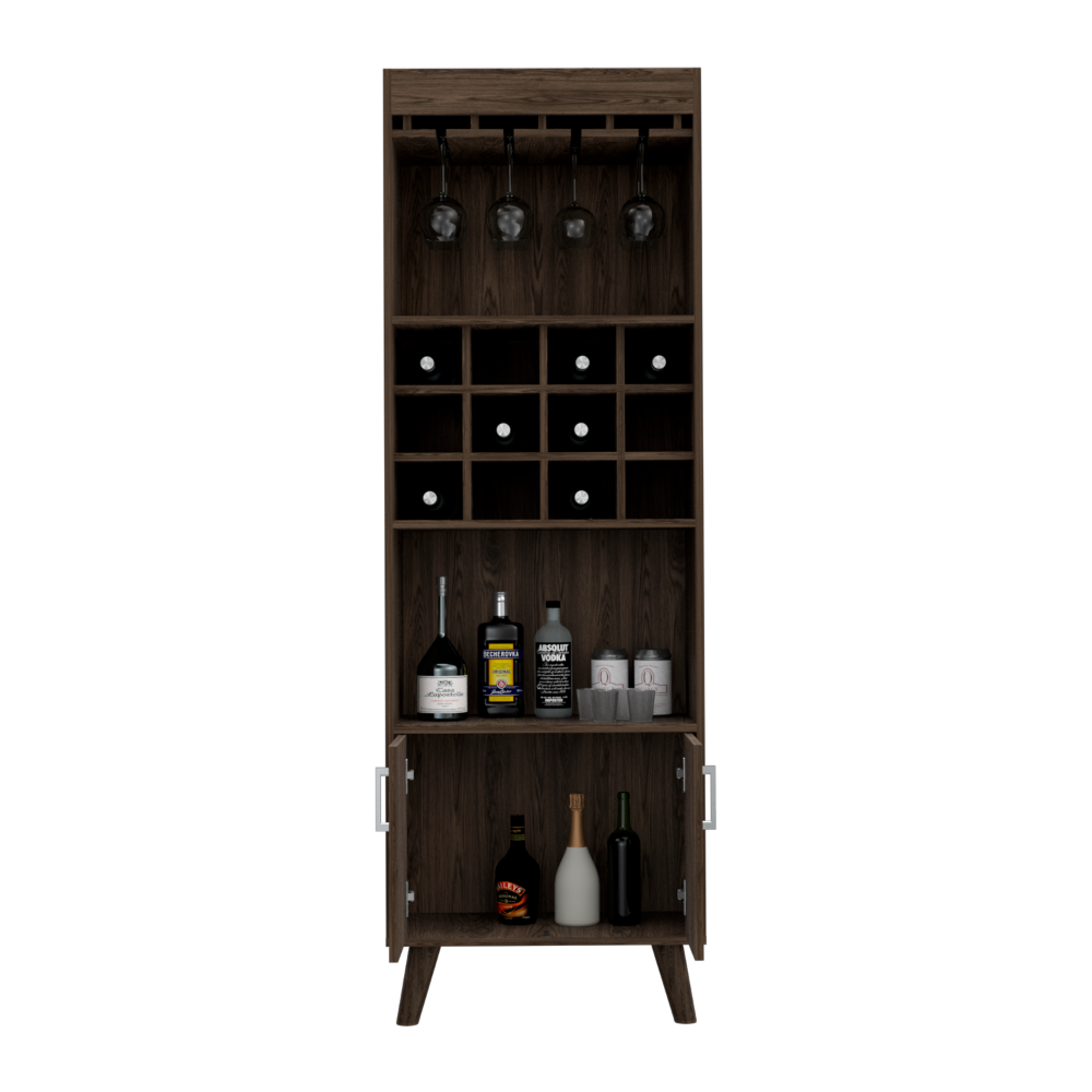 Introducing the Harvey Bar Double Door Cabinet - a unique, exclusive, and elegant addition to your home decor. This stylish and functional home bar is perfect for hosting parties or simply relaxing after a long day. With its twelve wine cubbies (5.1''), you can store your favorite bottles and always have them within reach. The cabinet also features two ample shelves (22.4''W X 14.5''H) for storing spirits, mixers, and glasses. Crafted with a dark walnut manufactured wood finish, the Harvey Bar Cabinet exudes sophistication and charm.