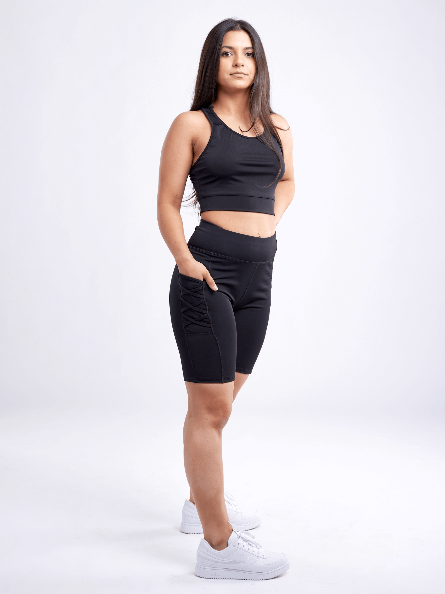 - High-Waisted Workout Shorts with Pockets & Criss Cross Design