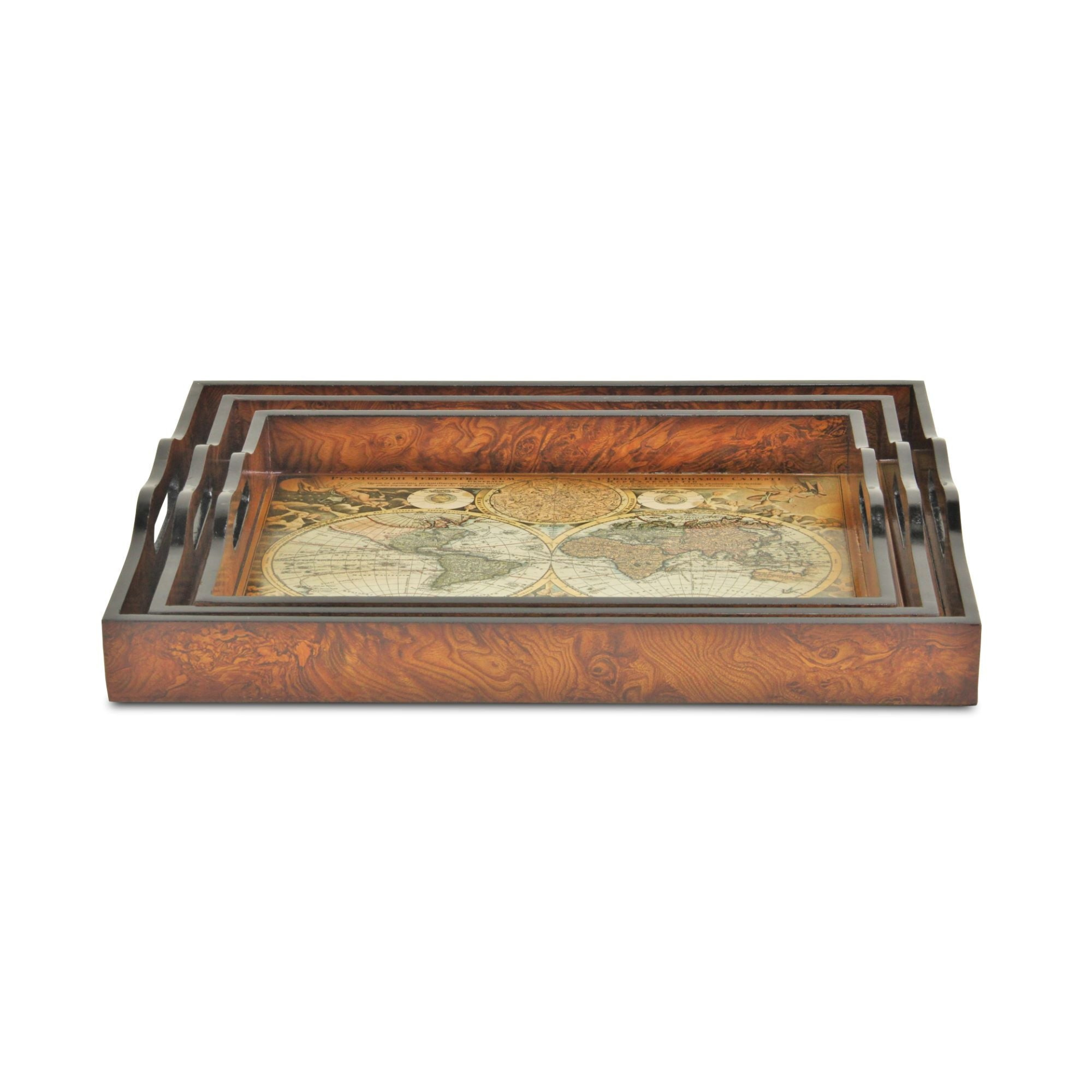 Set of Three 19" Brown Burl Wood Vintage Map Design Handmade Trays with Handles