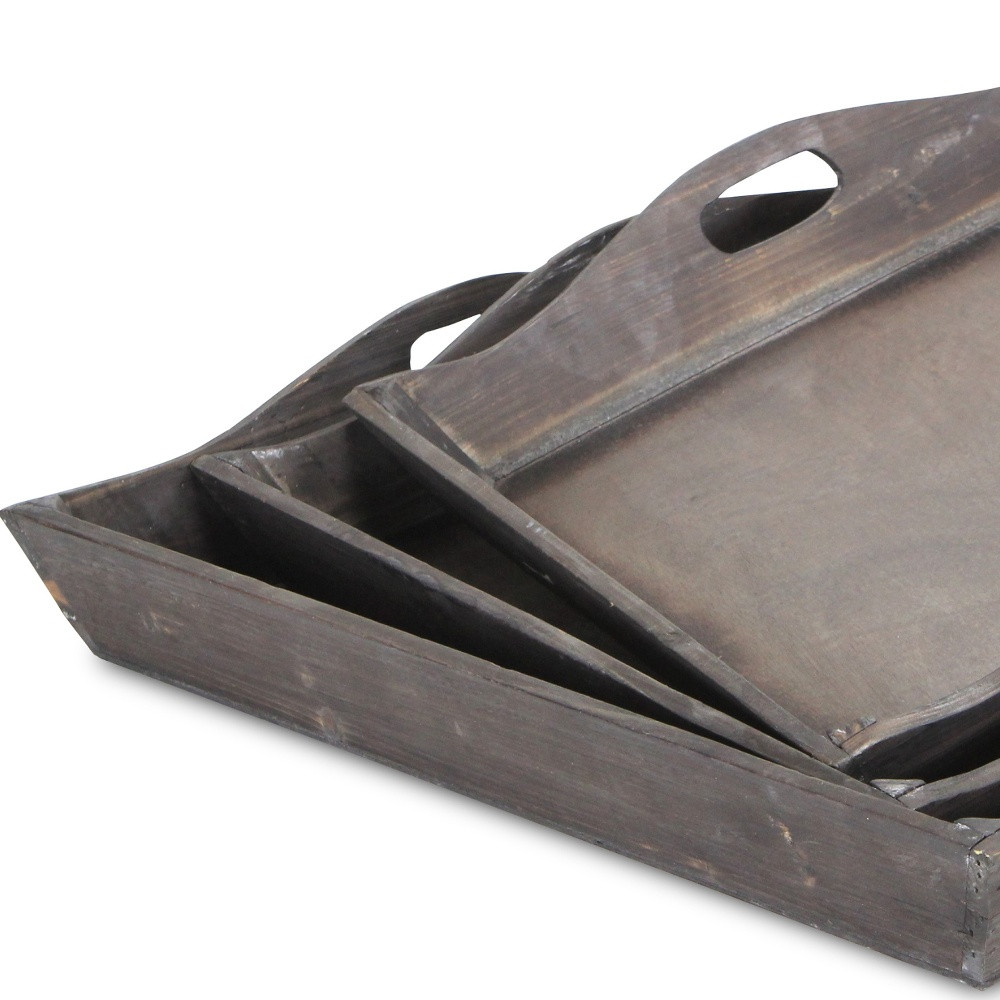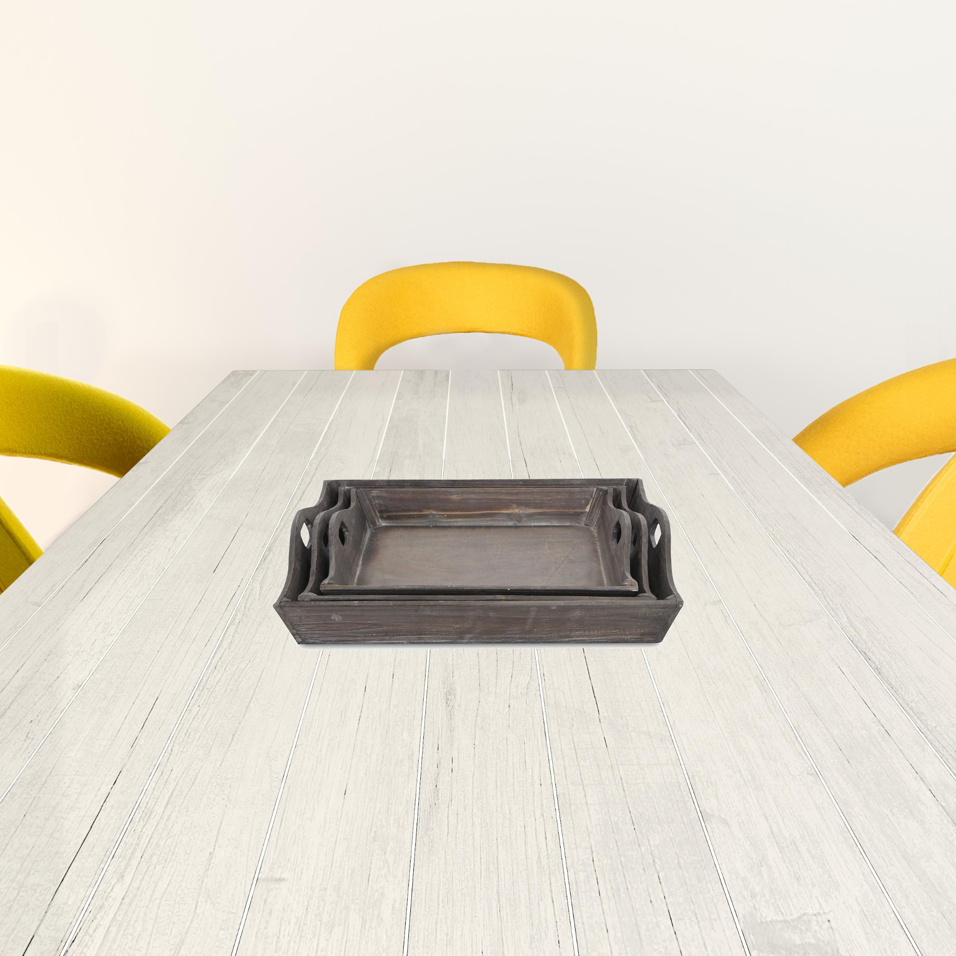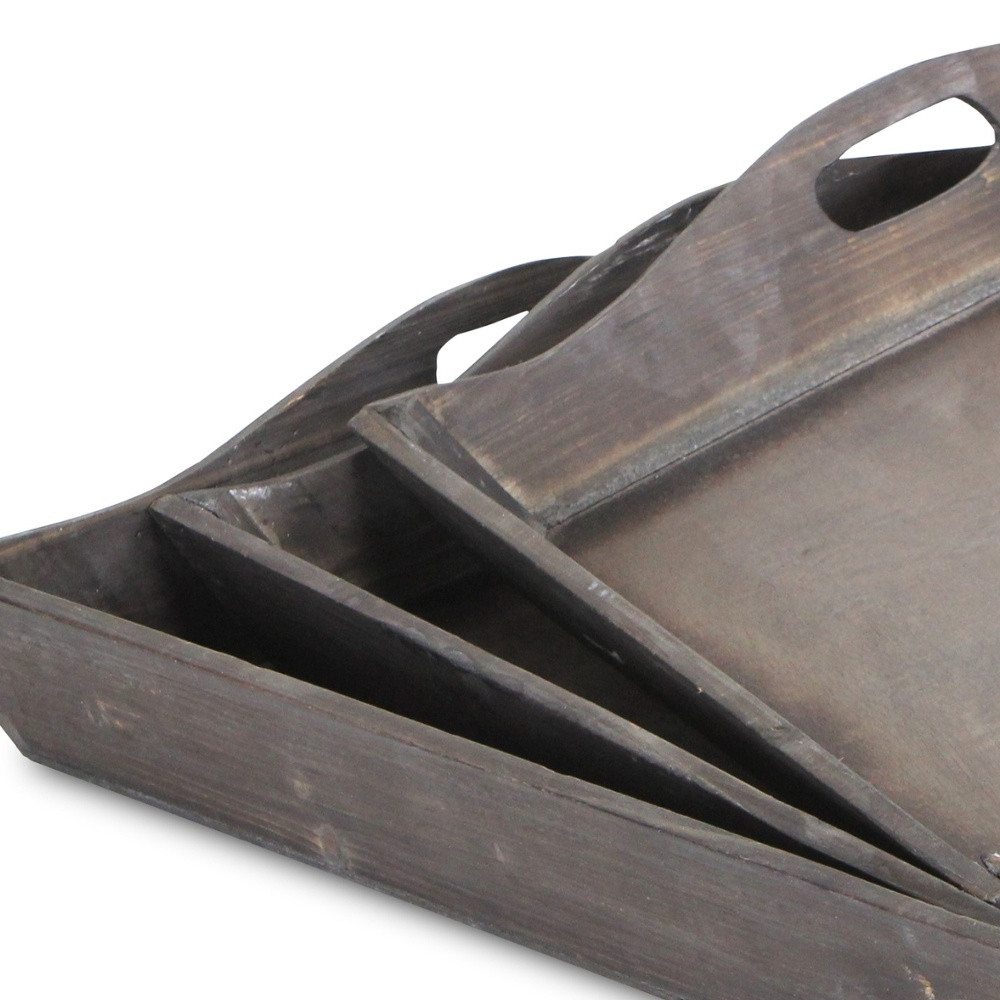 Enhance the charm of your space with this set of three rustic brown wood handmade trays with handles. These versatile trays are perfect for adding a beautiful decorative accent to your home. Crafted with solid wood construction and featuring a distressed and vintage design style, this tray set offers an overall timeless appearance and natural appeal.