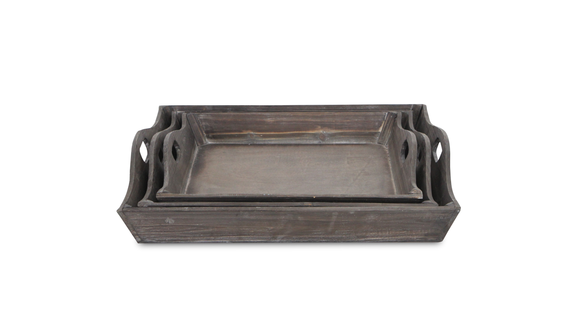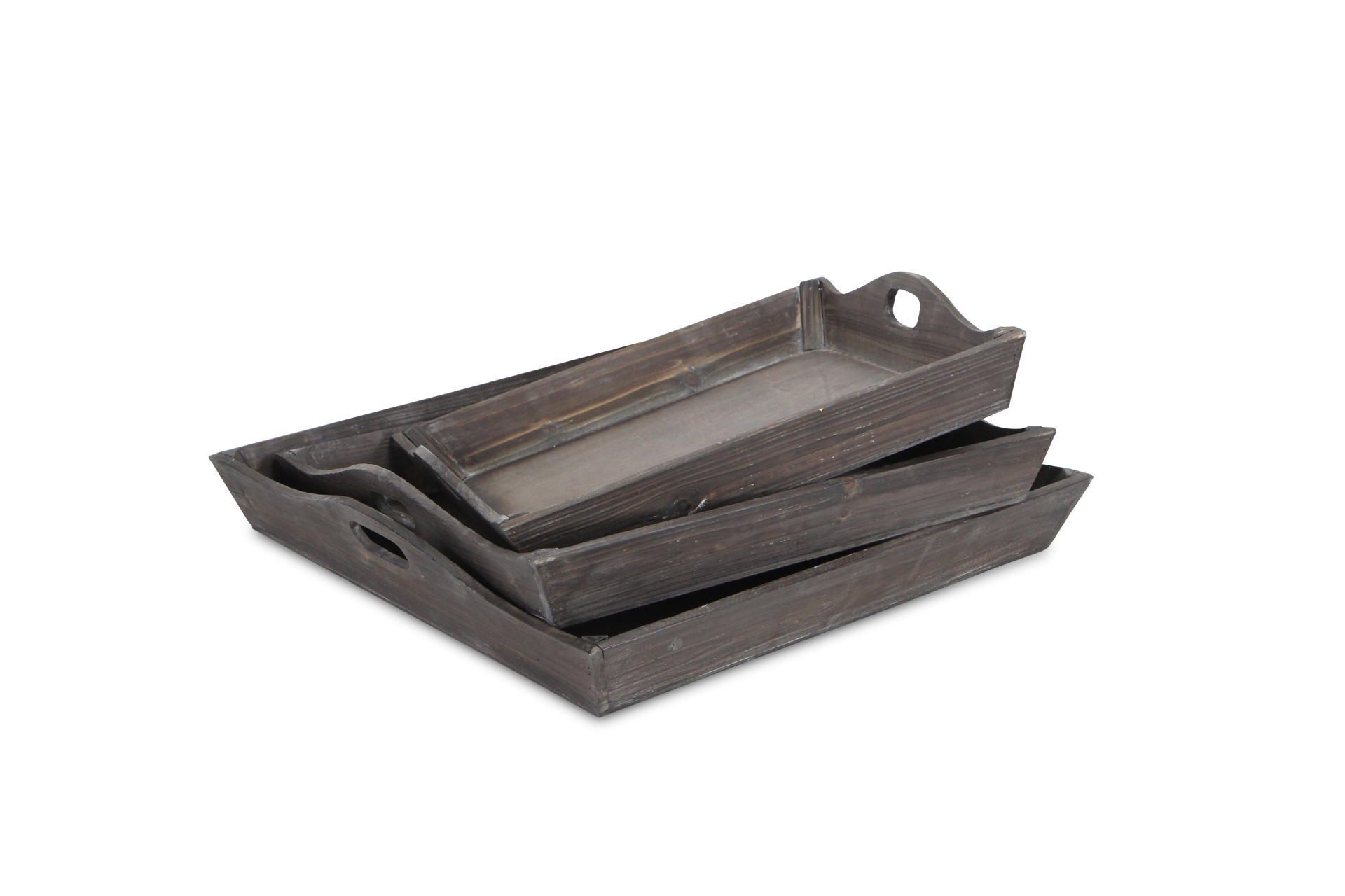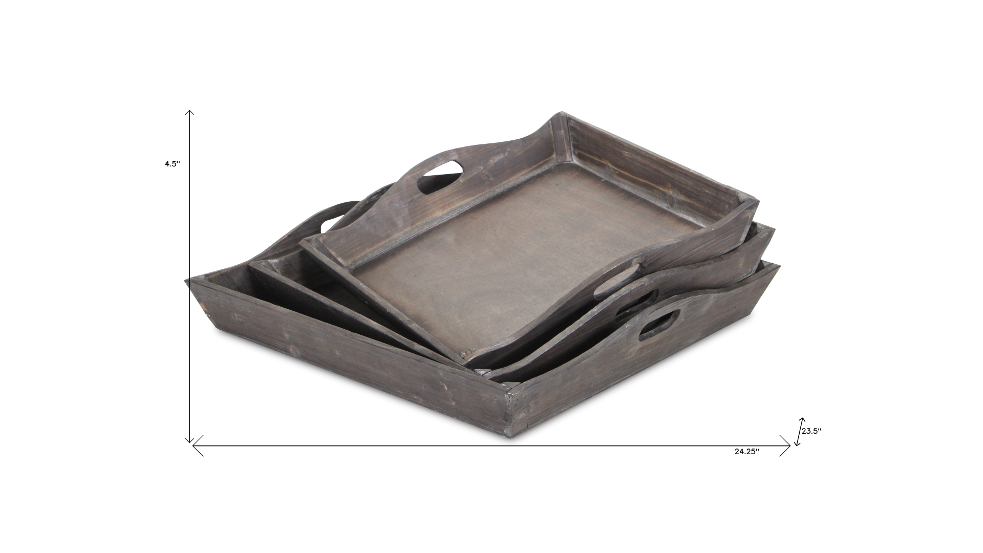 Enhance the charm of your space with this set of three rustic brown wood handmade trays with handles. These versatile trays are perfect for adding a beautiful decorative accent to your home. Crafted with solid wood construction and featuring a distressed and vintage design style, this tray set offers an overall timeless appearance and natural appeal.