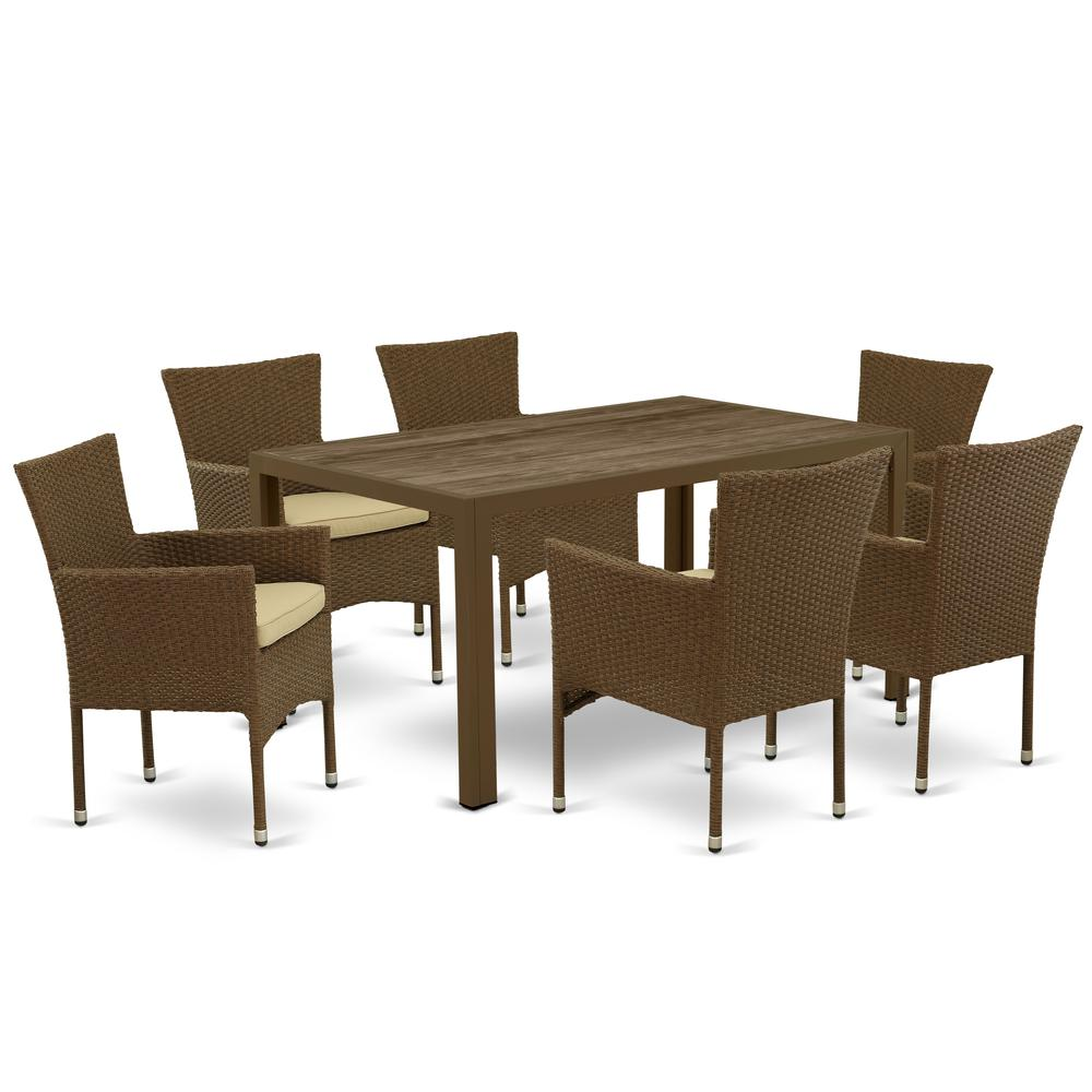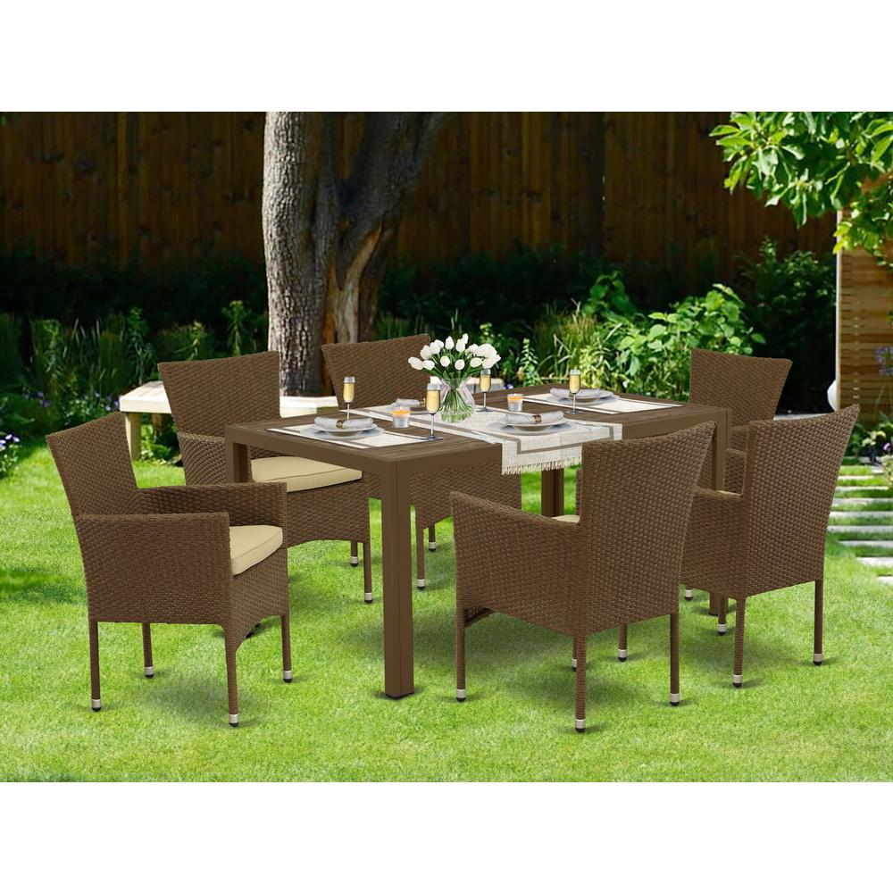 Wicker Patio Set Brown, JUBK7-02A - Outdoor Furniture Set with Acacia Wood Tabletop and Cushioned Armchairs