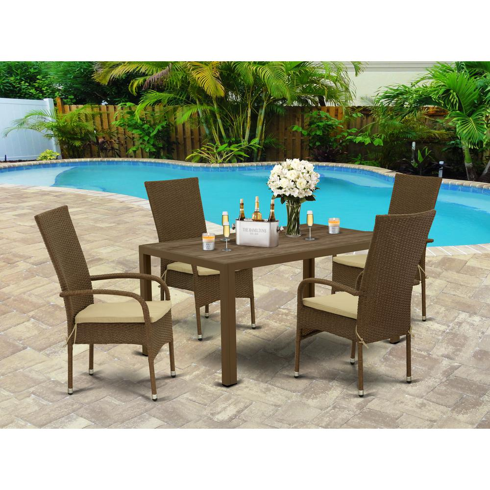 Upgrade your outdoor dining experience with the Wicker Patio Set Brown, JUOS5-02A. This 5-piece set includes an acacia wood top table and four single arm chairs, providing both functionality and comfort. Constructed with a lightweight steel frame and wrapped with woven resin wicker fiber, this weather-resistant patio set is designed to withstand the elements and last for years to come.