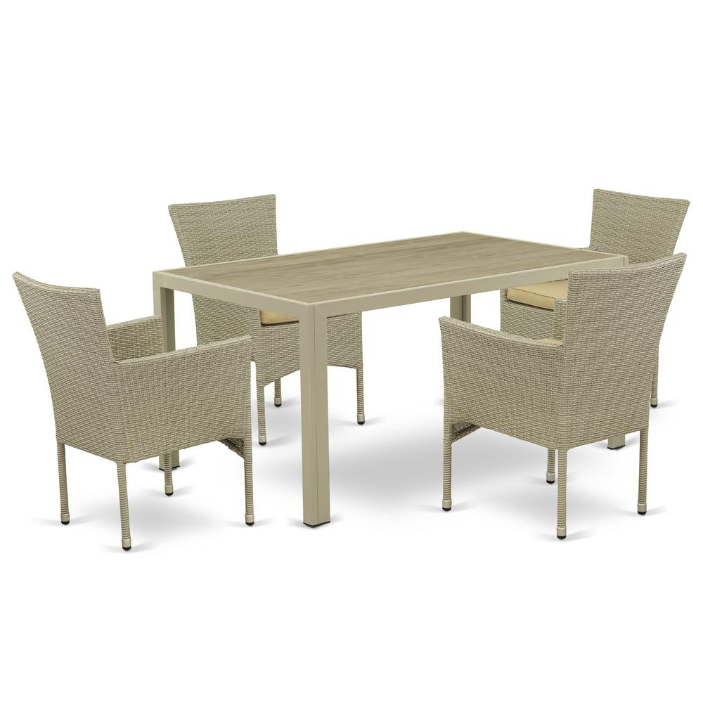 Furnish your patio dining area with this elegant and durable wicker patio set. The set includes a natural linen-colored 5-piece outdoor furniture set featuring a spacious acacia wood table and four comfortable single arm chairs. With its solid construction and weather-resistant design, this patio set offers functional use and maximum comfortability.