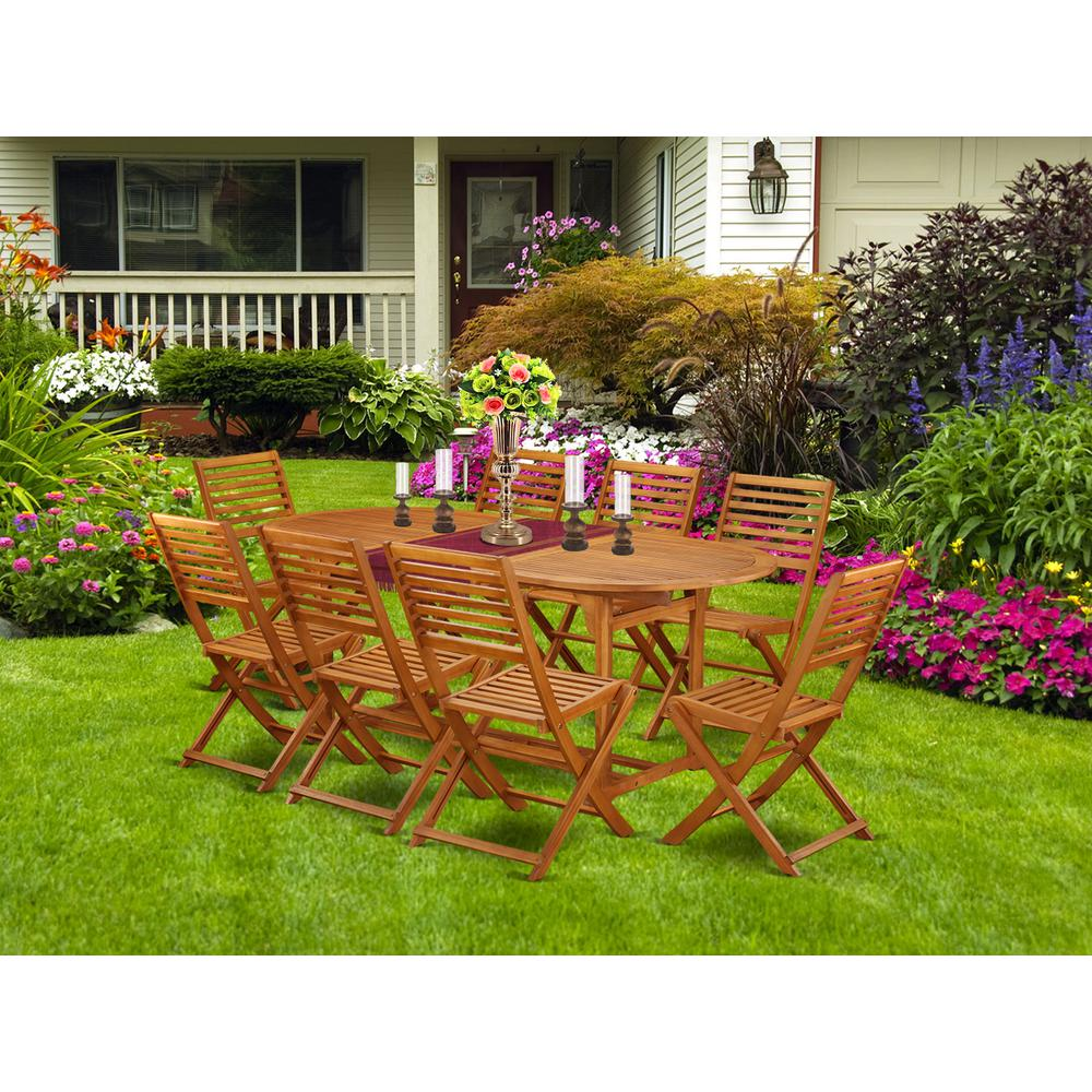Enhance your outdoor space with this exquisite wooden patio set. The BSBS9CWNA Outdoor-Furniture dining set includes 8 spacious side chairs and a stylish table, providing ample seating for relaxed entertaining. Made from acacia wood, a sustainable resource, this set is not only environmentally friendly but also resistant to water and mold. The neutral finish adds a touch of elegance and complements any earthy color palette. Suitable for year-round use, this patio set is a must-have for any outdoor space.