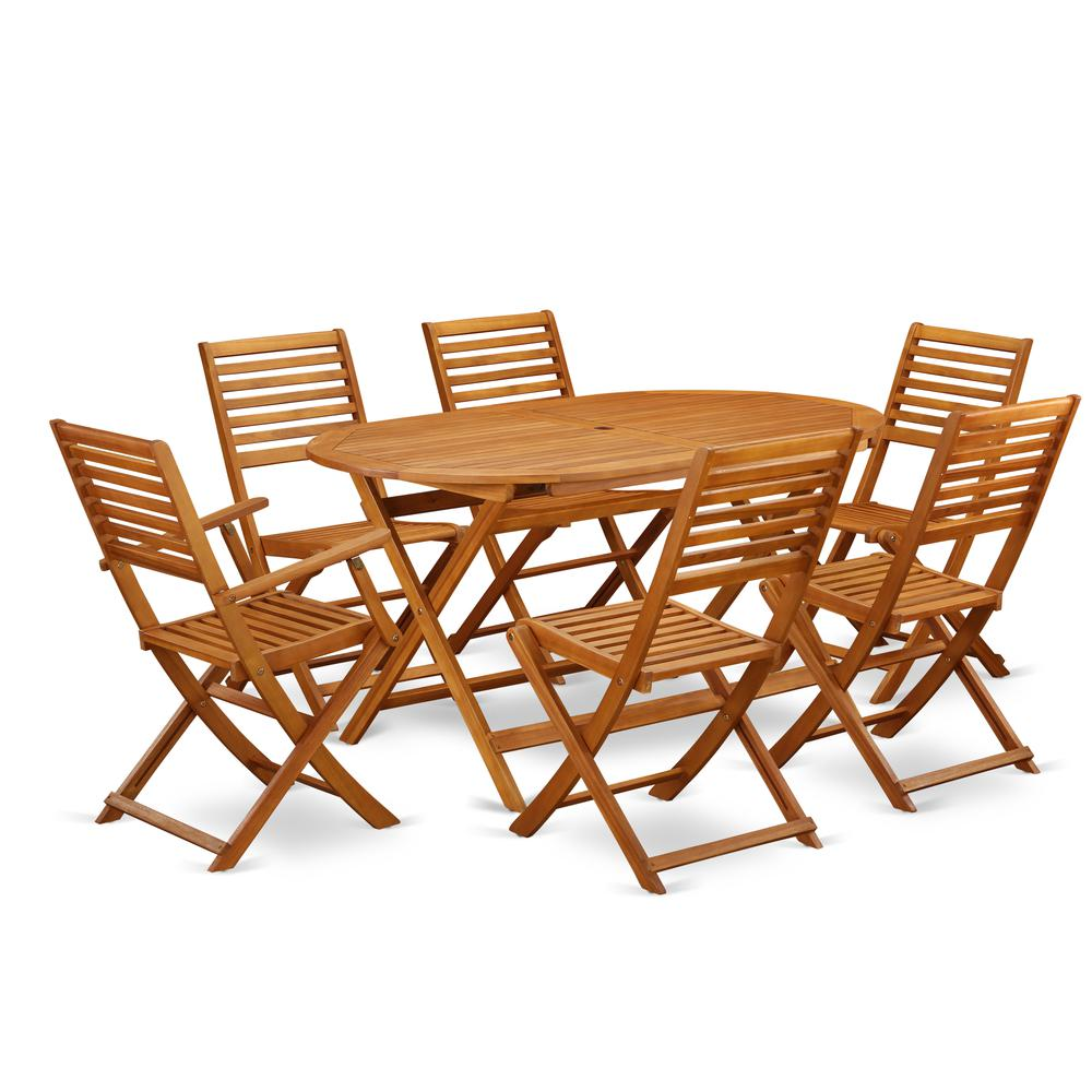 Create a comfortable and stylish outdoor dining area with the Wooden Patio Set Natural Oil, DIBS72CANA from Outdoor-Furniture. This 7-piece dining set includes two arm chairs, two spacious side chairs, and one table, perfect for relaxed entertaining and enjoying the outdoors. Crafted from sustainable acacia wood, this set is resistant to water and mold, making it ideal for year-round use.